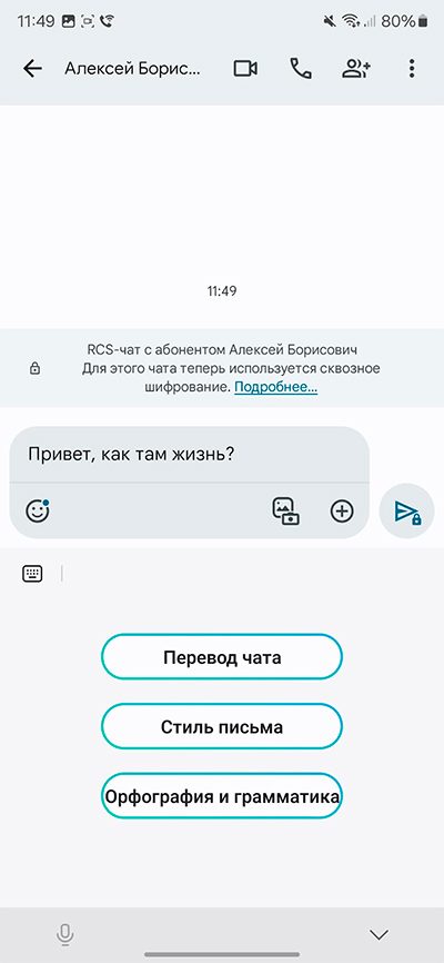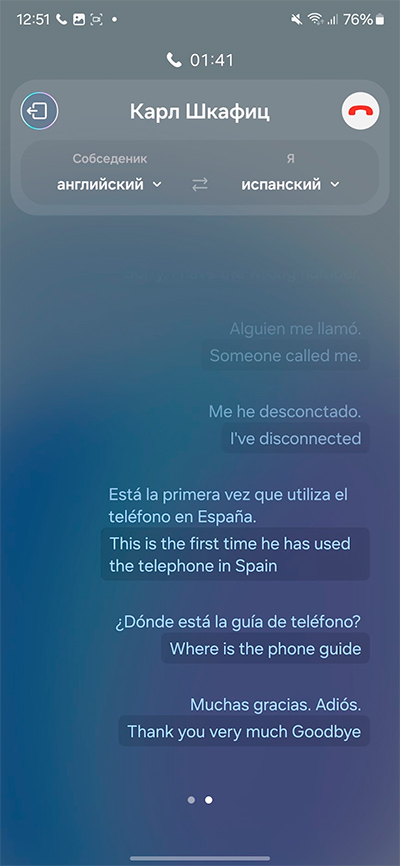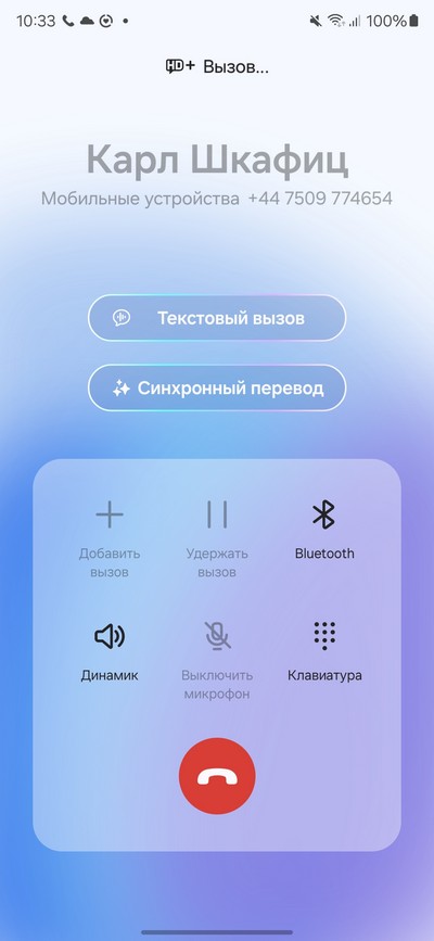 Входящий звонок. Записи разговоров здесь нет. (Это зависит от региона, в каких-то других регионах запись может быть.) Про "Текстовый вызов" и "Синхронный перевод" поговорим в разделе, посвященном Galaxy AI.