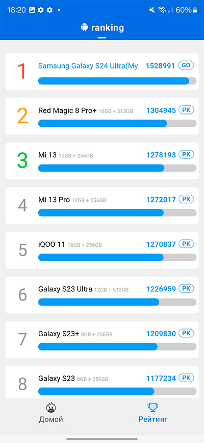 Индекс быстродействия по AnTuTu, рейтинг, где этот смартфон поставлен на первое место. У S23 Ultra этот индекс - 1144909.