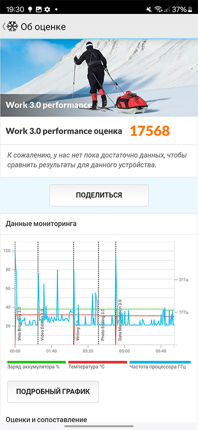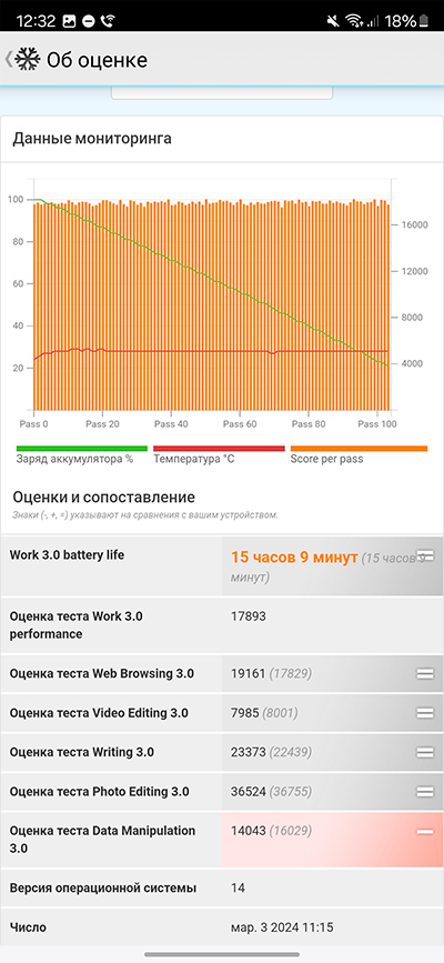Синтетический тест PCMark - важный показатель. И вот тут получилось почти ровно столько же, сколько у S23 Ultra, хотя Интернет и видео здесь протянули в полтора раза дольше.