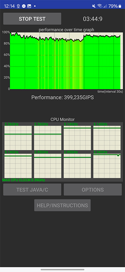 Ну и тест на троттлинг. Все хорошо, потеря производительности под нагрузкой очень незначительная, и по очень высокому GIPS видно, что производительность искусственно не занижается.
