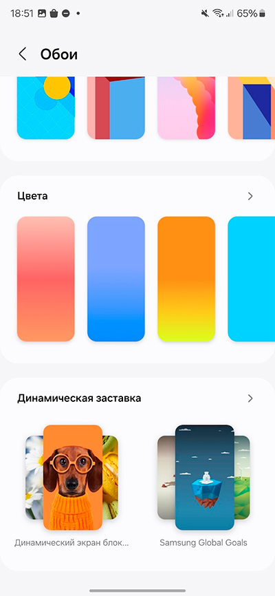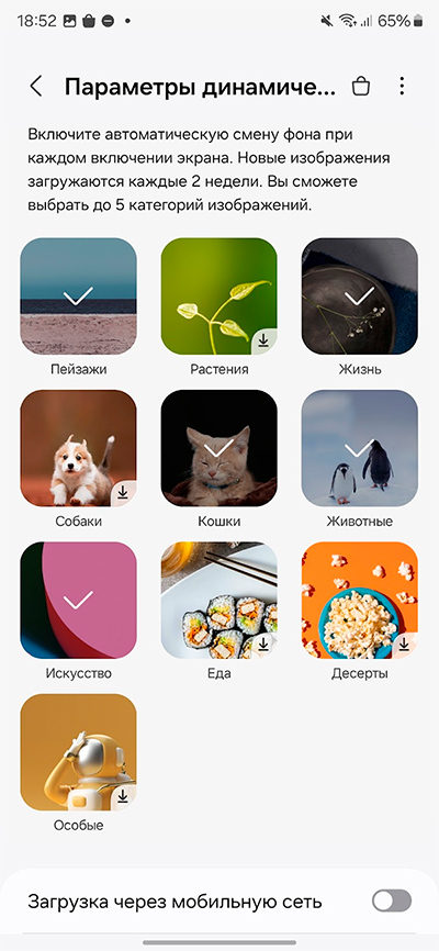 А еще для экрана блокировки и AOD можно выбрать динамическую смену изображений, для которой выбрать интересующие вас сюжеты. Изображения будут все время меняться, что здорово, также постепенно будут подгружаться новые изображения (можно задать, как их подгружать - только через WiFi или через мобильный Интернет тоже).