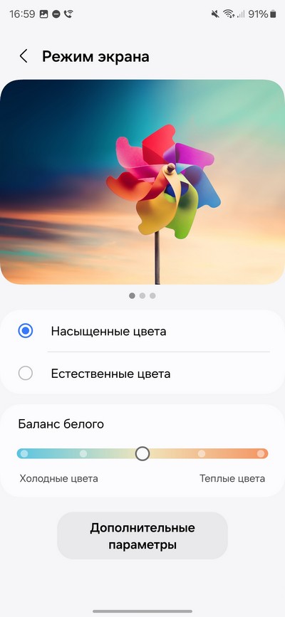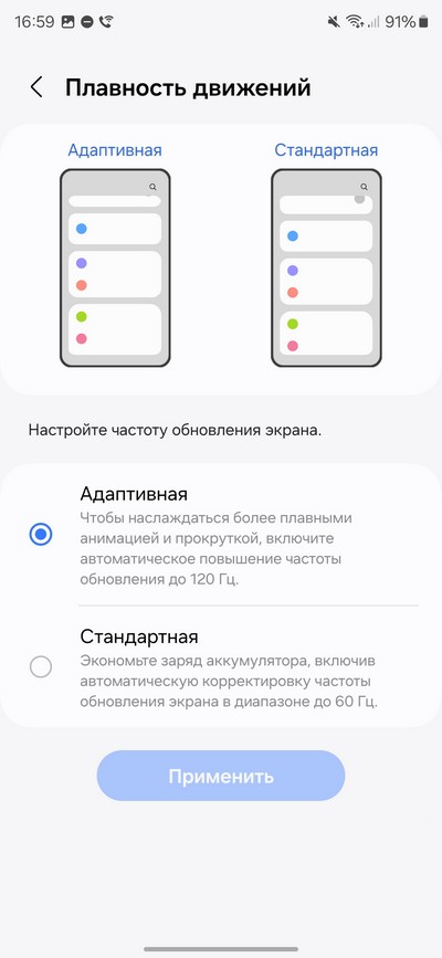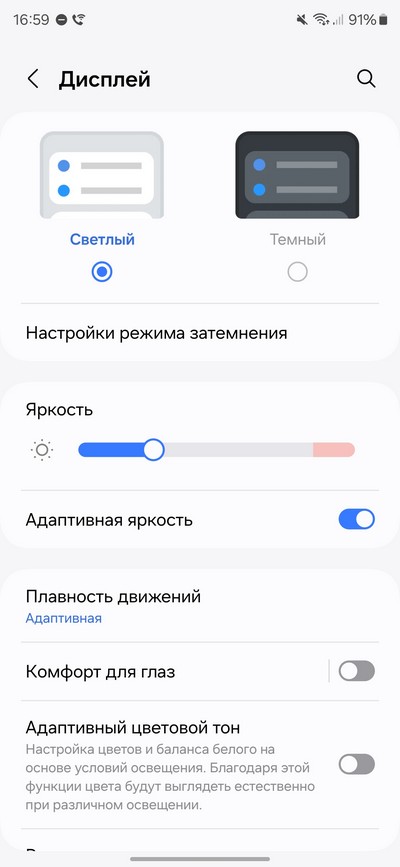 Как обычно, в настройках дисплея немало возможностей. Темная и светлая темы, можно менять размер шрифта и масштаб объектов. В настройке частоты обновлений (прямо 120 Гц выставить нельзя, можно выставить стандартные 60 Гц или адаптивную частоту, чтобы смартфон сам выставлял повышенную частоту, когда считает нужным).