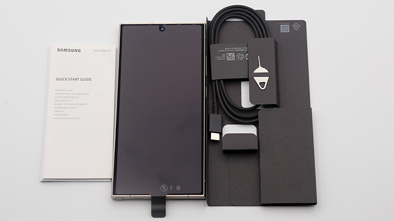 В комплекте: смартфон, руководство пользователя, инструмент для вытаскивания вставки под симкарты. Да, ну и я не устану удивляться совершенно поразительному жлобству компании Samsung, который в комплекте к дорогущему смартфону не кладет ни соответствующий адаптер питания (тут все-таки 45 Вт PD 3.0, такие адаптеры просто так ни у кого в ящиках не валяются), ни копеечный силиконовый чехол. Я еще хоть как-то могу понять компанию Apple, которая с определенного момента перестала класть зарядный адаптер в комплекте - у них все равно до сих пор зарядка довольно медленная, так что старые адаптеры подойдут. Но тут-то все-таки 45 Вт! Мы платим €1400 за смартфон и должны еще к нему отдельно за €40 адаптер покупать - офигенно! Жлобы конкретные, другого слова у меня для них нет.