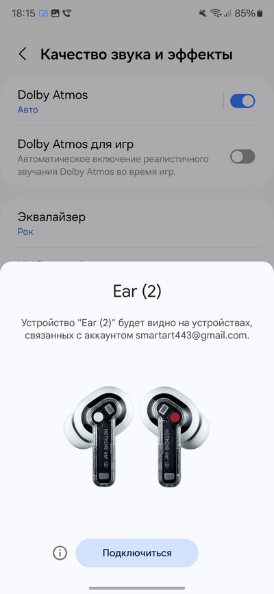 Для проверки беспроводного звучания подключил наушники Nothing Ear (2). Смартфон их сразу же обнаружил и подключил.