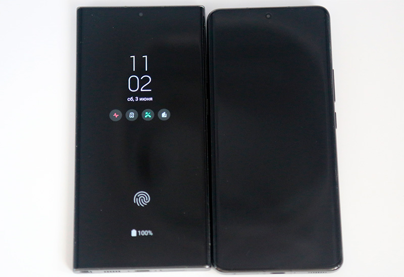 Ну и вот этот смартфон (справа) рядом с Samsung Galaxy S23 Ultra. S23 Ultra рядом с ним выглядит "лопатистее".