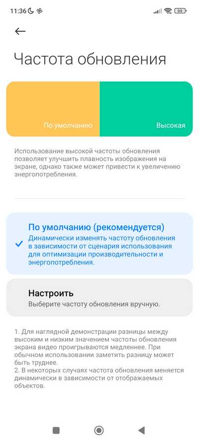 Частоту обновления можно задавать принудительно, а можно выбрать динамическое изменение. Для разрешения экрана можно выбрать экономный режим, а можно поставить максимальную четкость.