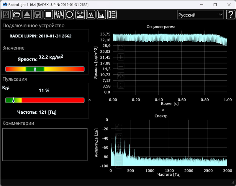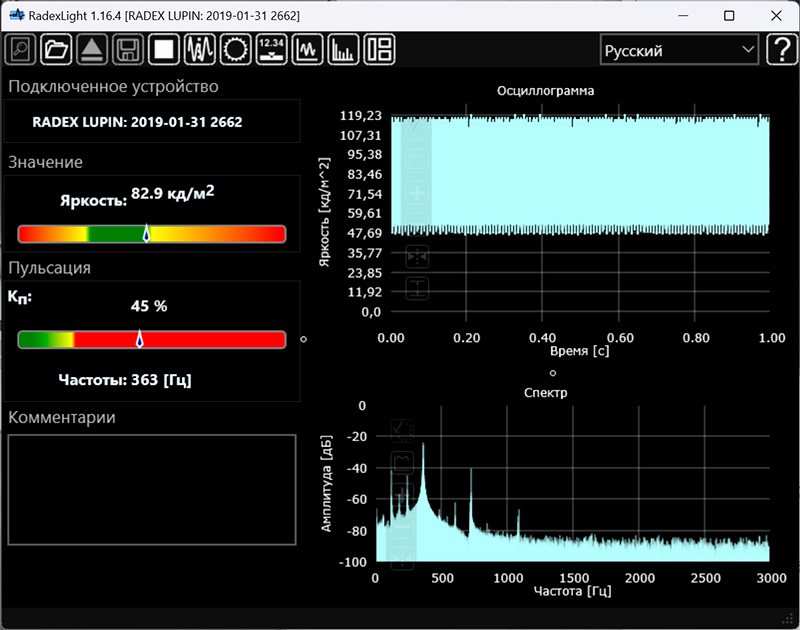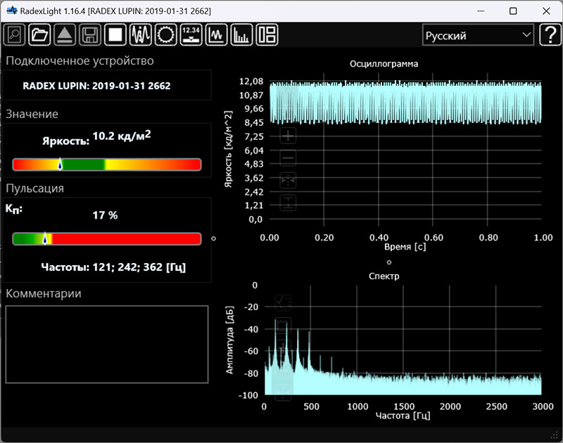 75% яркости - оба-на, пульсация в два раза выше нормы (но при достаточно высокой частоте в 363 Гц). Перепроверил несколько раз - да, явно выше нормы. Что же будет при 25% яркости - пульсация в 200%?