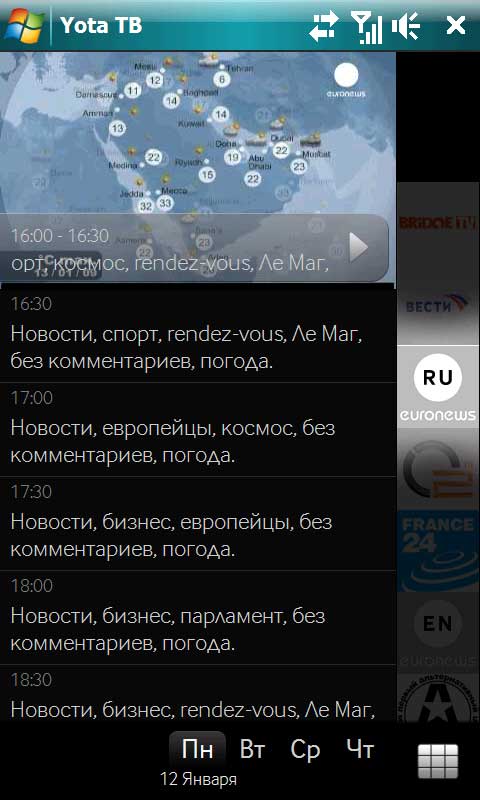 Онлайновое телевидение. Справа - список каналов, слева сверху - окно предпросмотра, слева снизу - программа. При щелчке по окну предпросмотра канал разворачивается на весь экран.