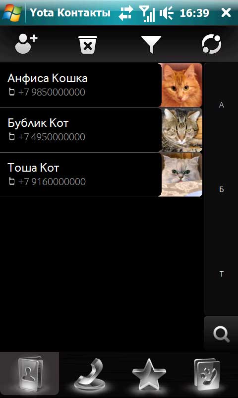 Это тот сервис, ради которого убрали закладку "Люди" основной оболочки. Список контактов, поиск контакта, набор номера, избранные контакты, фильтрация, группы по алфавиту, входящие, исходящие и пропущенные звонки. Сделано неплохо, но, на мой взгляд, SPB Phone Suite все-таки удобнее. Особенно учитывая тот факт, что информацию о звонках с его помощью можно вынести на главную страницу. Также данная утилита связана с личным кабинетом на сайте Yota - с ним можно синхронизировать контакты.