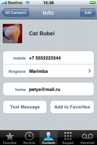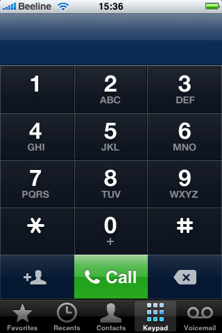 Телефон. Работа с телефоном в iPhone мало чем отличается от работы с телефоном в Windows Mobile. Список контактов, избранные абоненты, список звонков, телефонная клавиатура, голосовая почта.