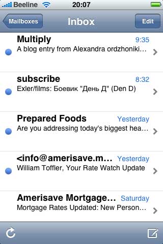 Я подключил ящик с GMail, потестировал - выглядит это все красиво и удобно. Скажем так, на коммуникаторе с Windows Mobile с почтой было работать менее удобно.