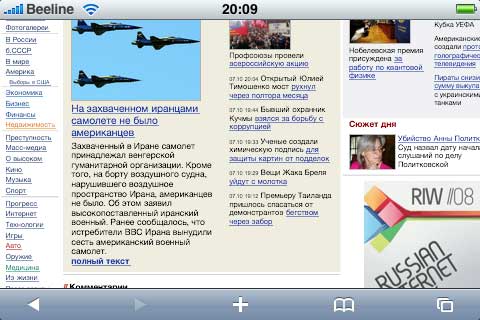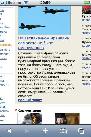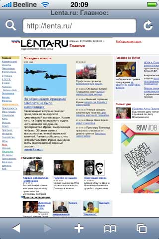 Конечно, пальцами выбирать пункты меню обычных сайтов не очень удобно, потому что часто промахиваешься, однако если при этом слегка масштабировать страничку, тогда попадаешь по нужным разделам уже без проблем. Большинство обычных сайтов на iPhone смотрится вполне нормально.