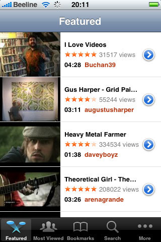YouTube. Выход на специальную мобильную версию YouTube, предпросмотр самых популярных роликов, просмотр выбранных роликов.