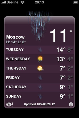 Weather. Традиционный для коммуникаторов сервис погоды. В данном случае берется с Yahoo. Выглядит вполне информативно, вы можете задавать несколько  городов.