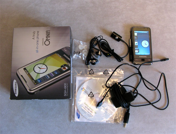 Комплектация у i900 довольно аскетичная: питание от сети, кабель к USB, гарнитура, диск с софтом. (Разработчики сказали, что есть еще один вариант комплектации, куда входит еще куча всего: держатель для автомобиля, зарядка для автомобиля, переходник на 3,5 мм, навигационная программа на карте памяти, дополнительный аккумулятор, крэдл, чехол и так далее.)