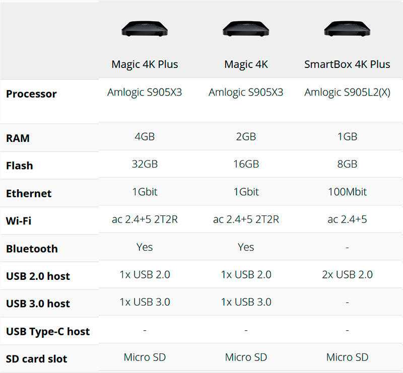 У SmartBox 4K Plus платформа попроще, сеть стомегабитная, нет поддержки Bluetooth и USB 3.0. Поэтому я сначала для теста хотел приобрести Magic 4K, однако в испанском Амазоне Magic 4K Plus стоил дороже буквально на 10 евро, так что я приобрел именно его. Модель Plus отличается только большей ёмкостью памяти, более ничем.