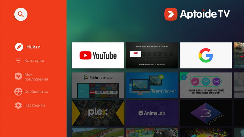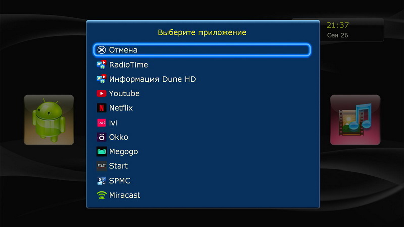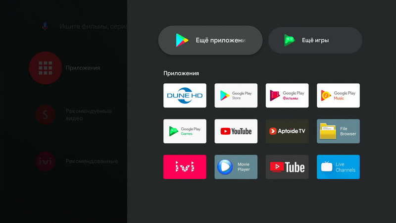 Приложения Android. Здесь, кроме Google Play Маркет и всяких популярных андроидных приложений, есть приложение Android TV, при запуске которого медиаплеер начинает работать под управлением Android TV.