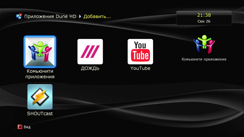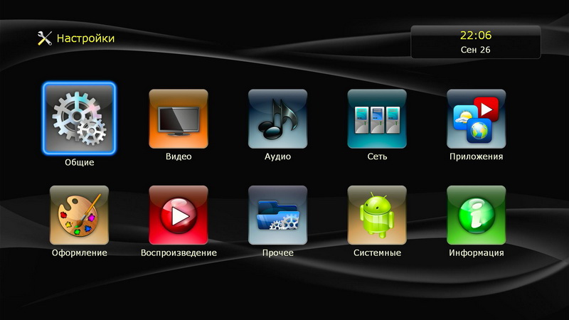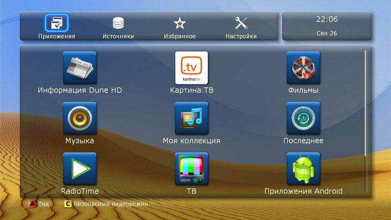 Основные пиктограммы: источники, информация Dune HD, последнее, избранное, настройки, моя коллекция, фильмы, ТВ, приложения Dune HD, приложения Android.