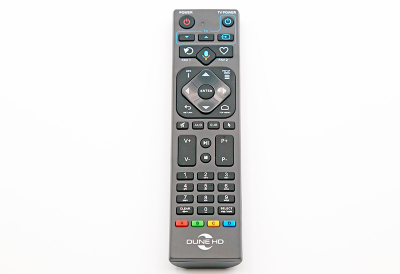 Пульт управления - стандартный дюновский. При этом он также может работать по Bluetooth, у него есть поддержка голосового поиска, режима AirMouse, и он имеет функцию ИК-обучения для телевизоров и другого оборудования. Мне пульты у Dune очень нравятся, они удобные. И хорошо что компания не прогибается под нынешнюю моду сокращать количество кнопок на пульте до двух-трех.