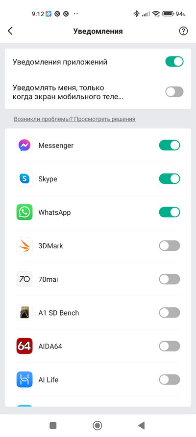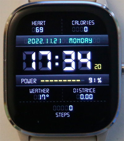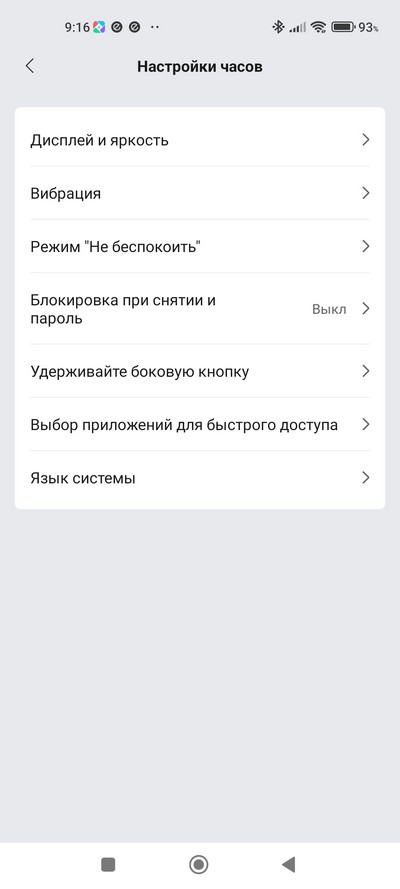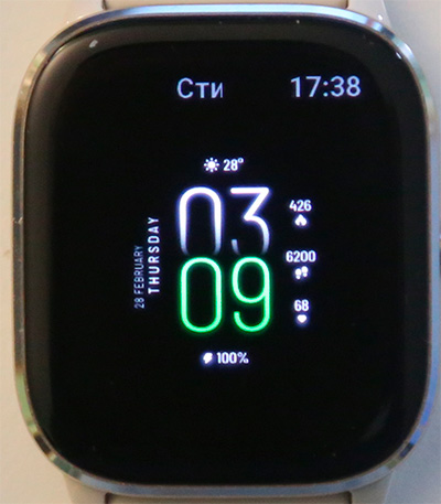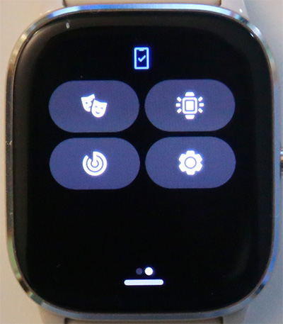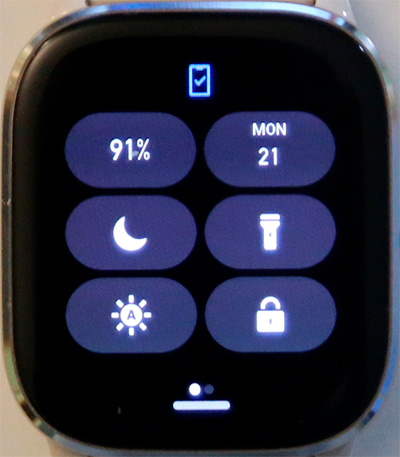 Свайп от циферблата вниз - информационные данные (дата, день недели, заряд аккумулятора, сопряжение со смартфоном) и пиктограммы переключателей: фонарик, настройка дисплея, режим "Не беспокоить", блокировка экрана от нажатий (для плавания), поиск телефона (он будет звонить), режим "Театр" (яркость экрана уменьшается, и отключаются режим постоянно включенного экрана и включение циферблата подъемом запястья) и постоянное включение дисплея в полном режиме (это работает только ограниченное время).