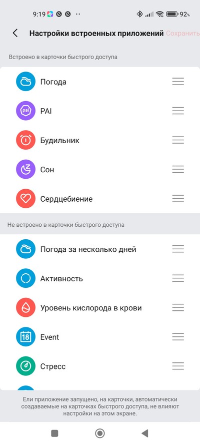 Настройки встроенных приложений для карточек быстрого доступа (виджетов).