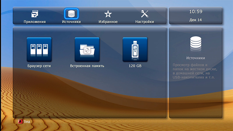 Заходим в источники. Нам показывают подключенный по SATA диск, браузер сети, смонтированный сетевой диск, встроенную память, подключенный внешний накопитель.