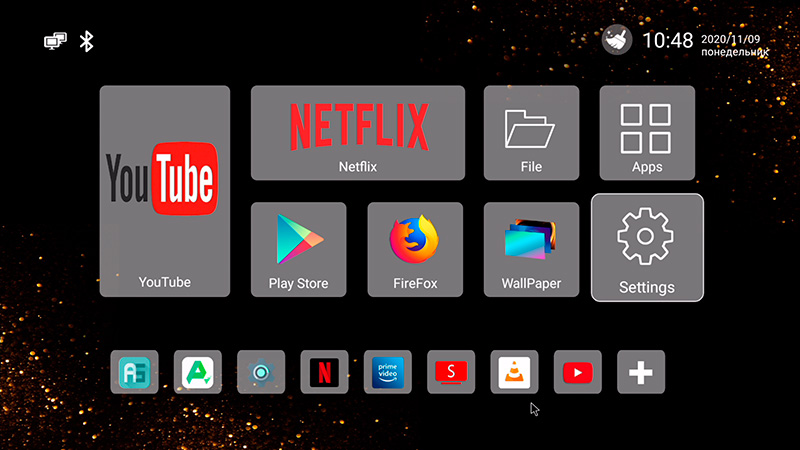 Теперь посмотрим, какие здесь настройки. Так как это не Android TV, а полноценный Android 9.0 с оболочкой медиаприставки, вы сюда можете закачивать любые программы, а настройки есть как для оболочки, так и полные.