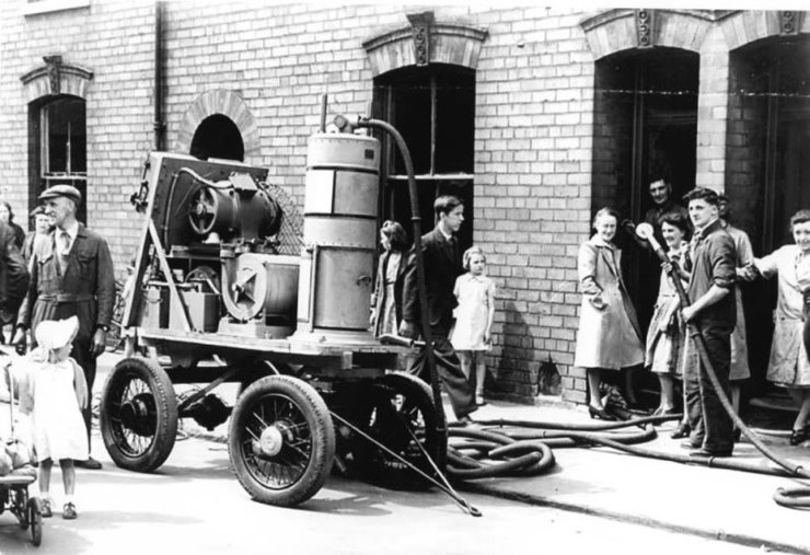 А в начале 20-го и до 30-х годов - была вполне себе популярная вещь как минимум, в Британии. Начиная от встроенных систем "поставщика ее (тогда "его") величества" компании "Гувер", заканчивая компрессором с пылесборником. Он подключался к домовой системе на определенное время, получал оплату и ехал дальше. К следующему дому, где была такая же система.