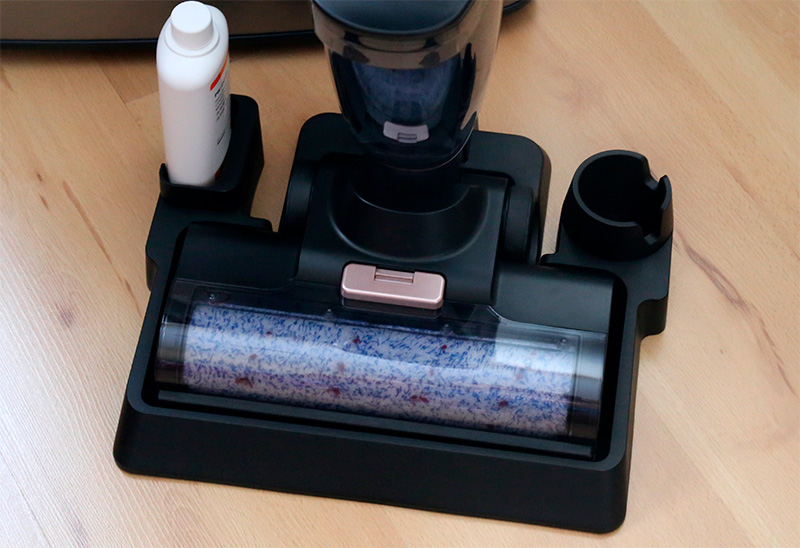В зарядной станции сделаны специальные отсеки, куда можно поместить: жидкость для сильного загрязнения, роликовую щетку, HEPA-фильтр и маленькую щетку для очистки.
