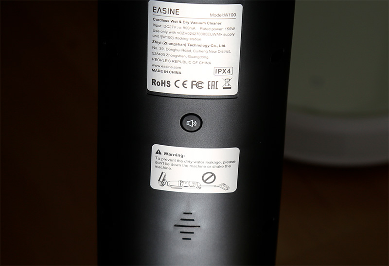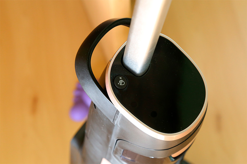 На задней поверхности пылесоса находится кнопка выключения-включения голосового ассистента. (Что, кстати, очень нелишнее, потому что ассистент, который вещает на английском, на мой взгляд, чересчур громкий.)