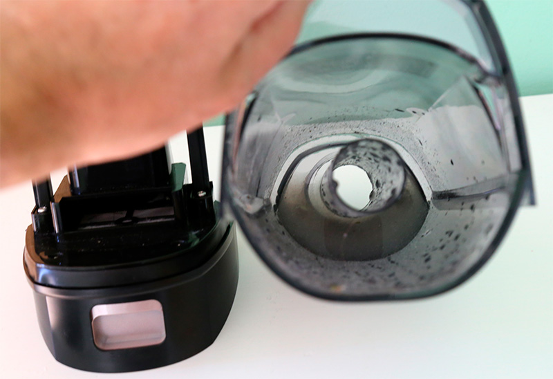 У мусорного контейнера снимается крышка с HEPA-фильтром, контейнер опорожняется и промывается. HEPA-фильтр также при необходимости можно вынуть и промыть.