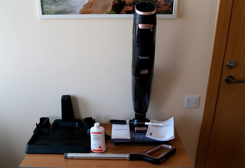 Комплект поставки: пылесос, ручка с кнопками управления, зарядная станция, адаптер питания, жидкость для очистки сильно загрязненных поверхностей, маленькая щетка для очистки, инструкция на нескольких языках, включая русский, гарантийный талон.
