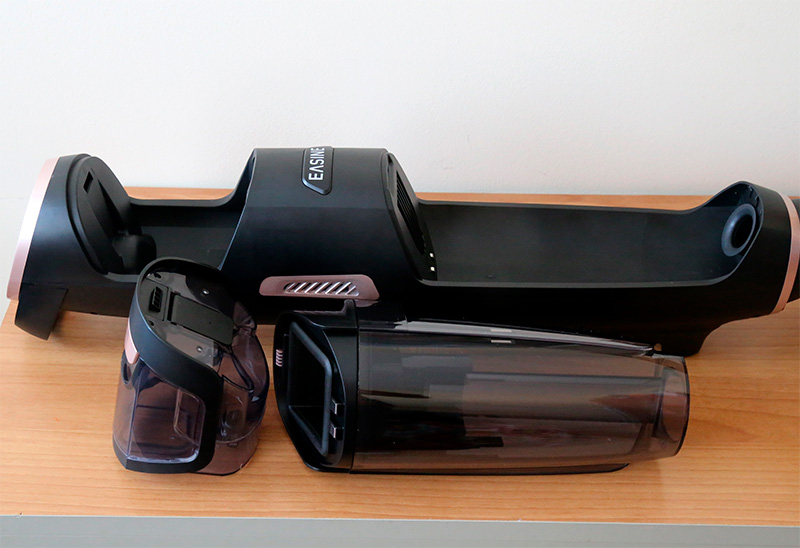 В корпусе пылесоса расположены две емкости: одна - для чистой воды, другая - для сбора пыли, мусора и отработанной воды. Обе емкости легко снимаются.