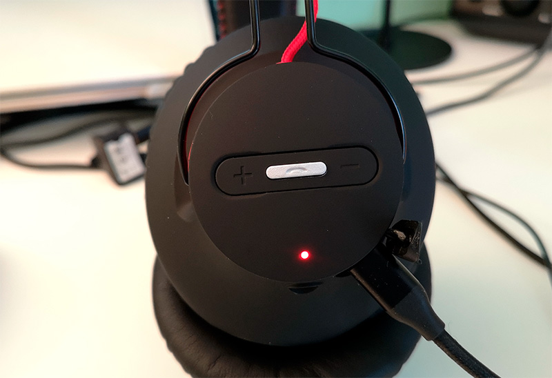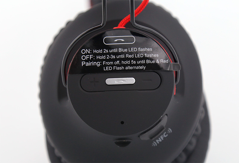 С торца левой чаши - кнопочное управление: кнопка ответа на звонок, она же играть/пауза, она же включение/выключение и режим сопряжения, кнопки трек вперед и трек назад, они же регулировки громкости (длинные нажатия). Одновременное нажатие плюса и минуса - вызов голосового помощника на смартфоне.