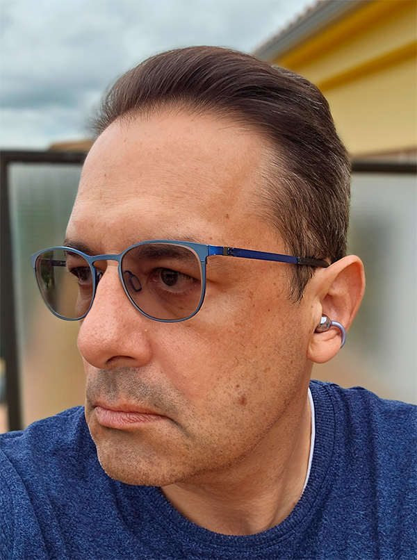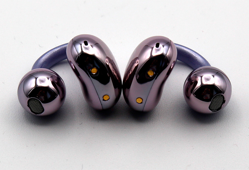 Наушники. Утолщенная часть с аккумулятором, микрофоном для шумоподавления при разговоре и сенсорным слоем для управления располагается на задней части ушной раковины, передняя часть с динамиком и разговорным микрофоном помещается в ушную раковину.
