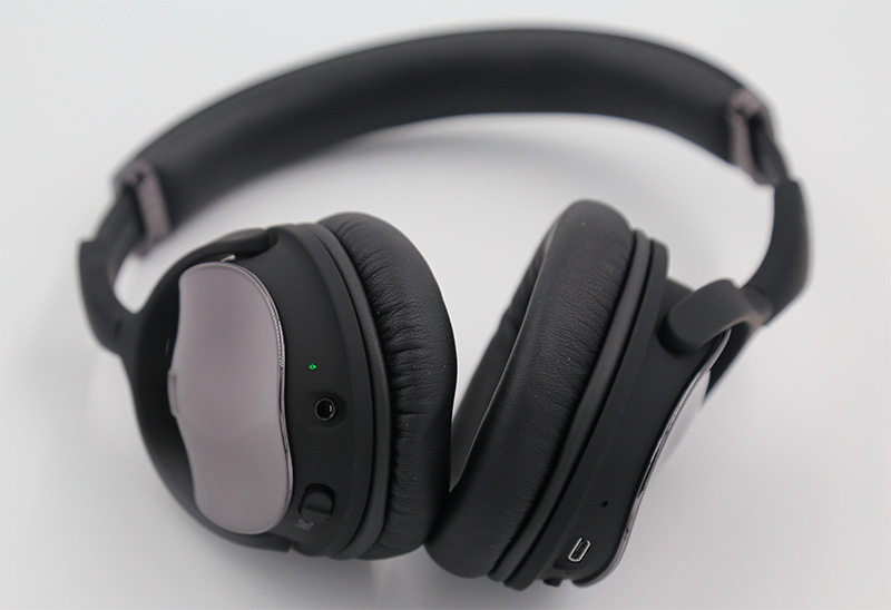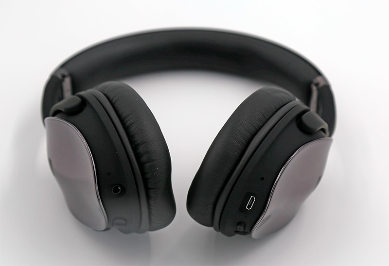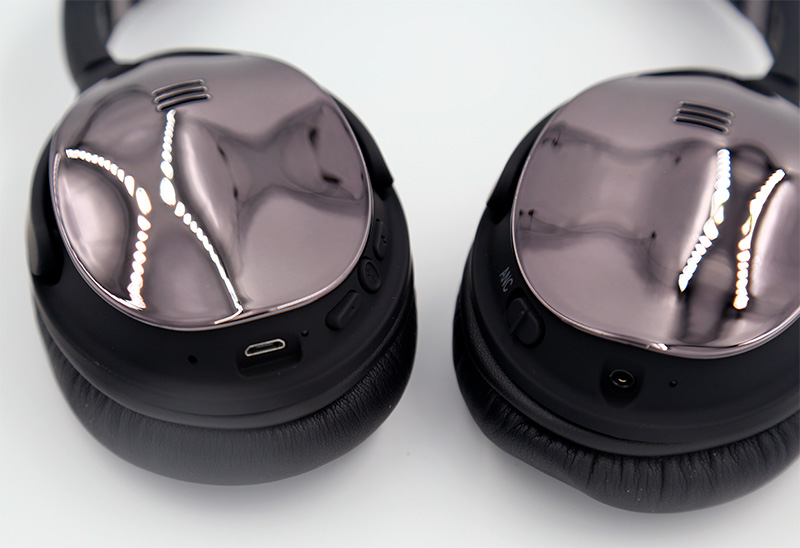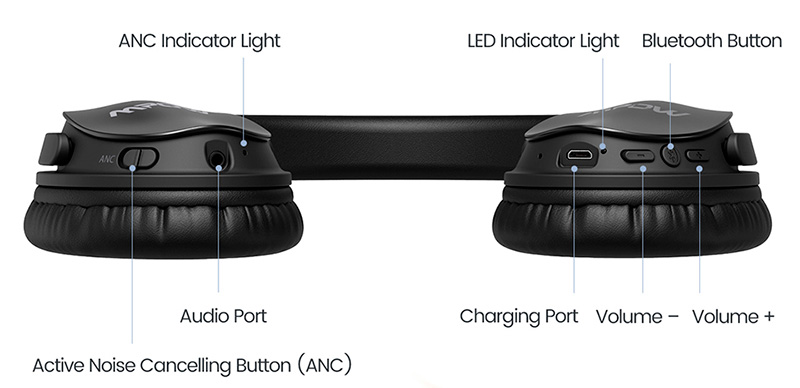 Порты и управление видны на схеме: кнопка включения активного шумоподавления, аудиопорт, индикатор активного шумоподавления, микрофон, порт microUSB, индикатор заряда, две кнопки регулировки звука и переключения треков, кнопка питания, она же - воспроизведение/пауза.