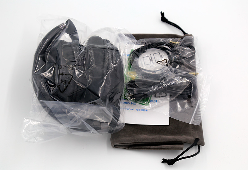 Комплект поставки: наушники, аудиокабель, кабель для зарядки USB-microUSB, инструкции на китайском и неожиданно очень качественный замшевый чехол.