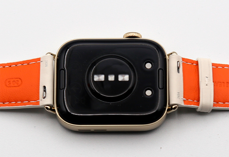 Нижняя крышка с датчкикам и двумя контактами для зарядки. Крепление ремешка - стандартное, ремешок шириной 20 мм. Также замечу, что застежка у ремешка (у этого, из экокожи, и у остальных силиконовых ремешков) - самая обычная, что и хорошо.
