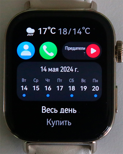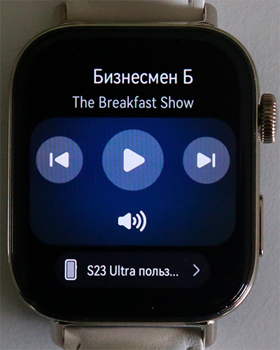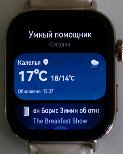От циферблата свайп вправо - так называмый "Умный помощник": виджет погоды и виджет воспроизведения аудио.