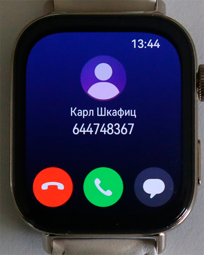 Входящий зконок. Его можно сбросить, принять прямо на часах, ответить предустановленным сообщением по SMS.