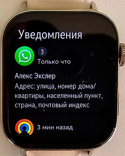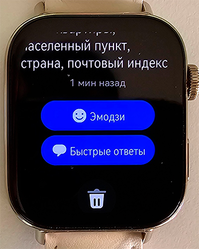 От циферблата свайп вверх - уведомления. Каждое уведомление можно раскрыть на весь экран и прочитать целиком. На уведомления можно отвечать смайликами или предустановленными сообщениями (они редактируется в приложении, я это выше показал).