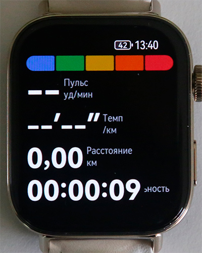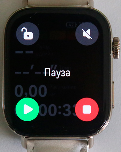 Тренировка. Там можно листать свайпом вверх различные окна с информацией, отслеживать свое местоположение с компасом. Свайп влево - управление плеером. Замечу, что здесь, как и у старших моделей часов, можно управлять воспроизведением со смартфона, а можно воспроизводить аудиотреки, закачанные в часы через приложение.