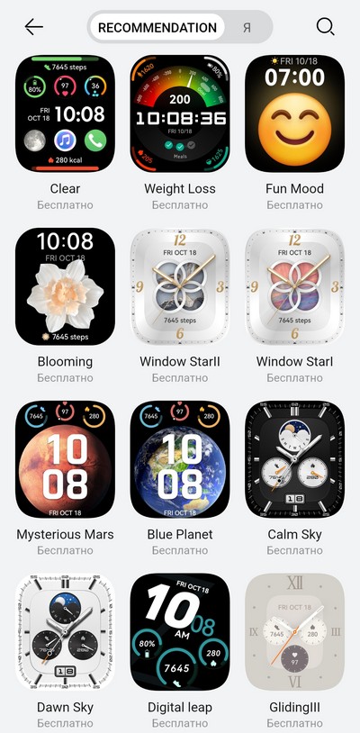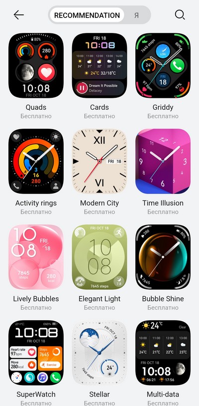 Циферблаты. Их достаточно много. Есть группа бесплатных циферблатов, также полно платных по цене от 2 до 4 евро.