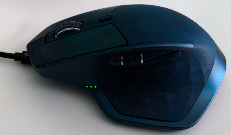 Слева от площадки под большой палец находятся три световых индикатора уровня заряда, но они загораются только в момент подключения мыши к зарядке или в момент включения мыши кнопкой. Что, кстати, не очень удобно, потому что о разряде мыши вы узнаете только тогда, когда соответствующее сообщение появляется на дисплее компьютера. Что мешало показывать уровень заряда, например, по нажатии на какую-нибудь клавишу - непонятно. Я, например, мышь никогда не выключаю, а выключать/включать только чтобы узнать уровень заряда - как-то это странно.