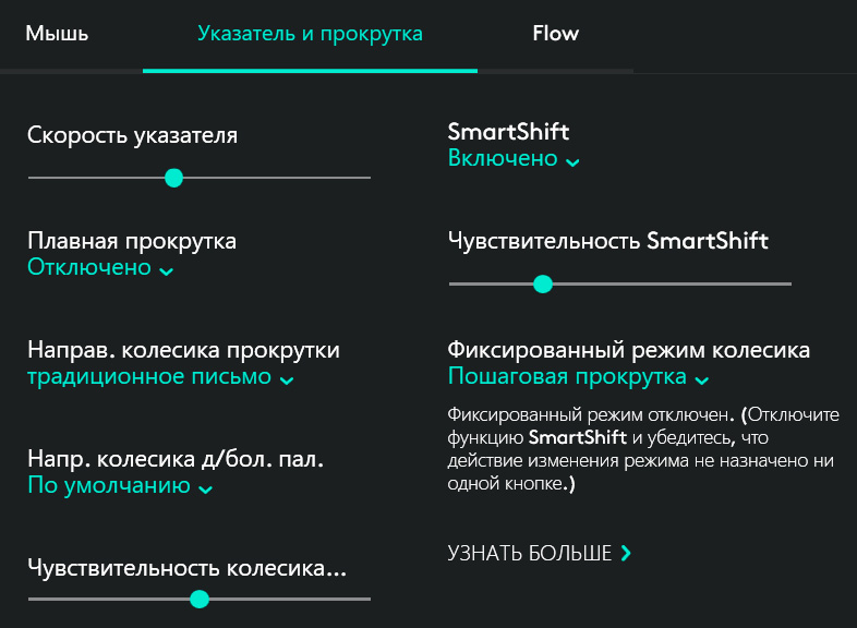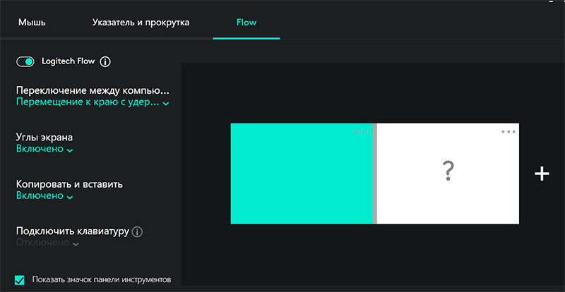 В третьей закладке в этой программе можно включить интереснейший режим Logitech Flow, который позволяет, во-первых, переключаться между компьютерами, с которыми сопряжена эта мышь, при подведении курсора мыши к краю экрана, а во-вторых, этот режим позволяет копировать текст, изображения и файлы на одном компьютере и сразу же вставлять их в нужное расположение на другом.