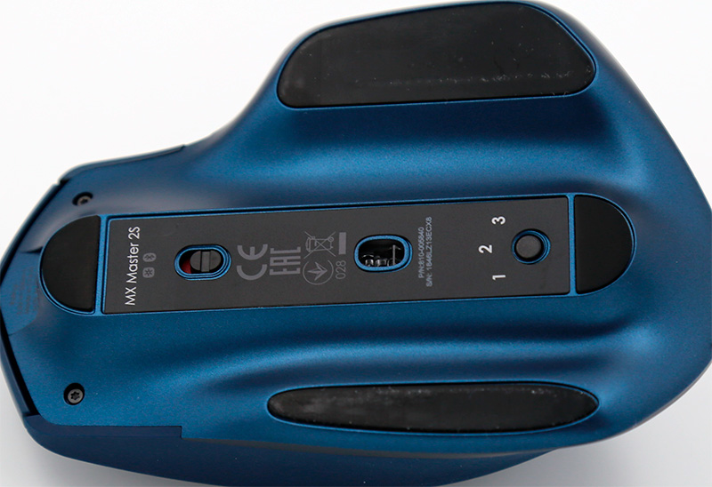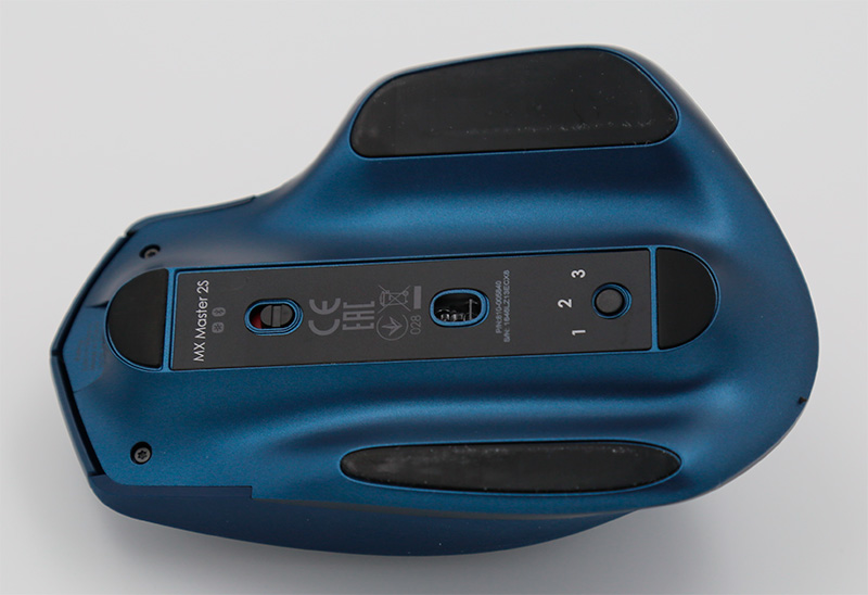 На нижней поверхности - кнопка питания, оптический датчик и кнопка переключения на одно из трех подключенных устройств: эту мышку можно использовать, например, для компьютера и пары ноутбуков. Переподключение производится нажатием одной кнопки - это отлично сделано, я теперь с ноутбуком отдельную мышку не вожу.