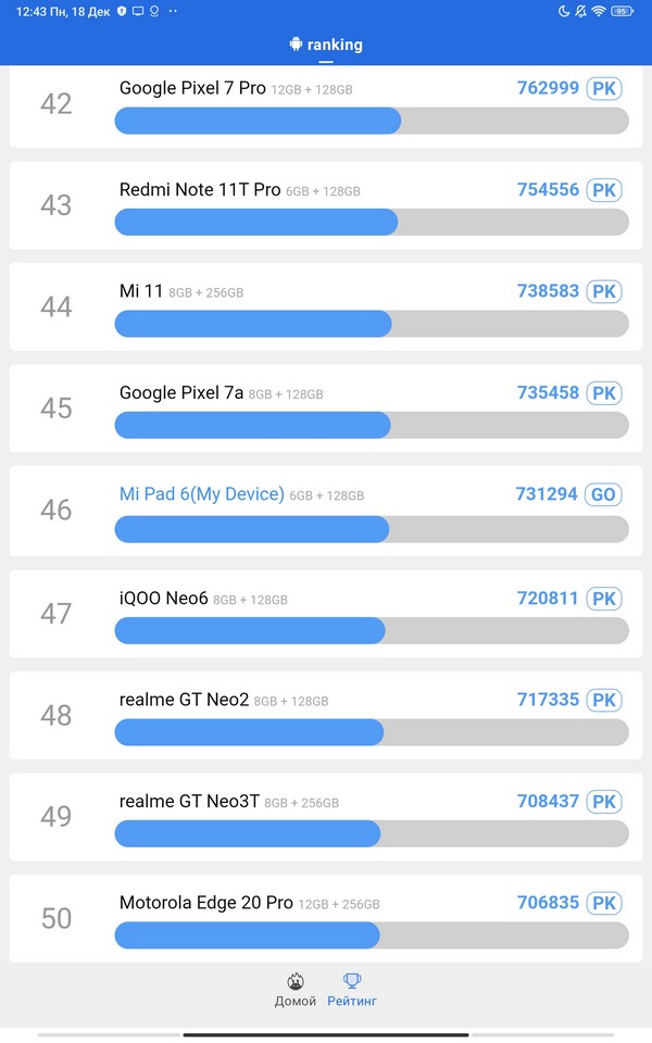 Тест быстродействия AnTuTu и позиция в рейтинге. У предыдущей модели было 492621.