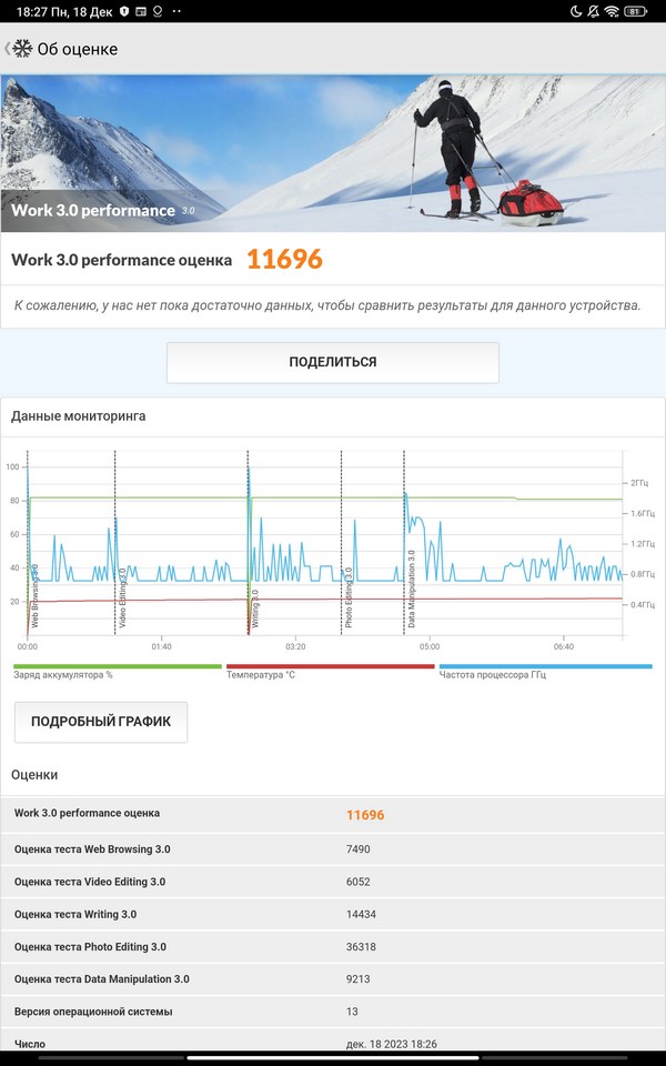 Синтетический тест PCMark. У меня этот тест не прошел - все время где-то через час после старта вылетал с криками о том, что на планшете что-то запустили, что мешает проведению теста. В одном из других обзоров я видел показатель 15 часов 25 минут - это вполне достойно.