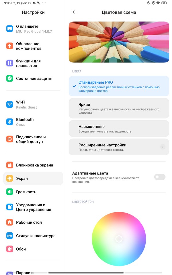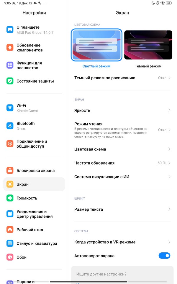 Настройки дисплея - обычные для оболочки MIUI, то есть достаточно продвинутые. Есть темный режим, режим чтения (в том числе по расписанию), настраиваются цветовая схема и цветовой тон, настраивается размер шрифтов.