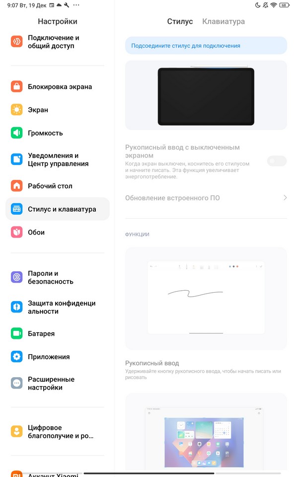 Для этого планшета выпущено стило Xiaomi Smart Pen 2nd generation, которое распознает 4096 уровней нажатия. От полной зарядки стило работает 150 часов.